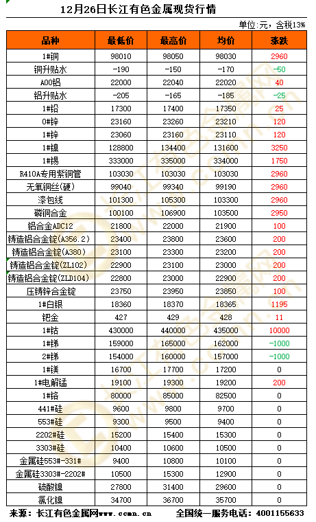 当前位置: 长江有色金属网 > 资讯首页 > 行业要闻 > 12月26日长江有色金属现货行情