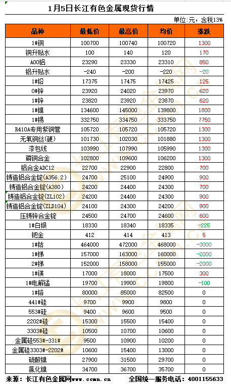 1月5日长江有色金属现货行情